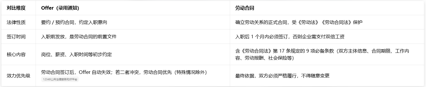 很多求职者会误以为 Offer 就是劳动合同,实则二者性质、效力、法律依据完全不同,核心区别如下: