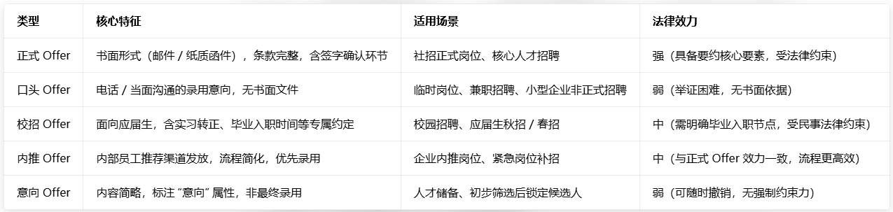 根据发放形式、适用人群及法律效力的不同,Offer 可分为以下几类,不同类型在细节约定和风险上存在明显差异: